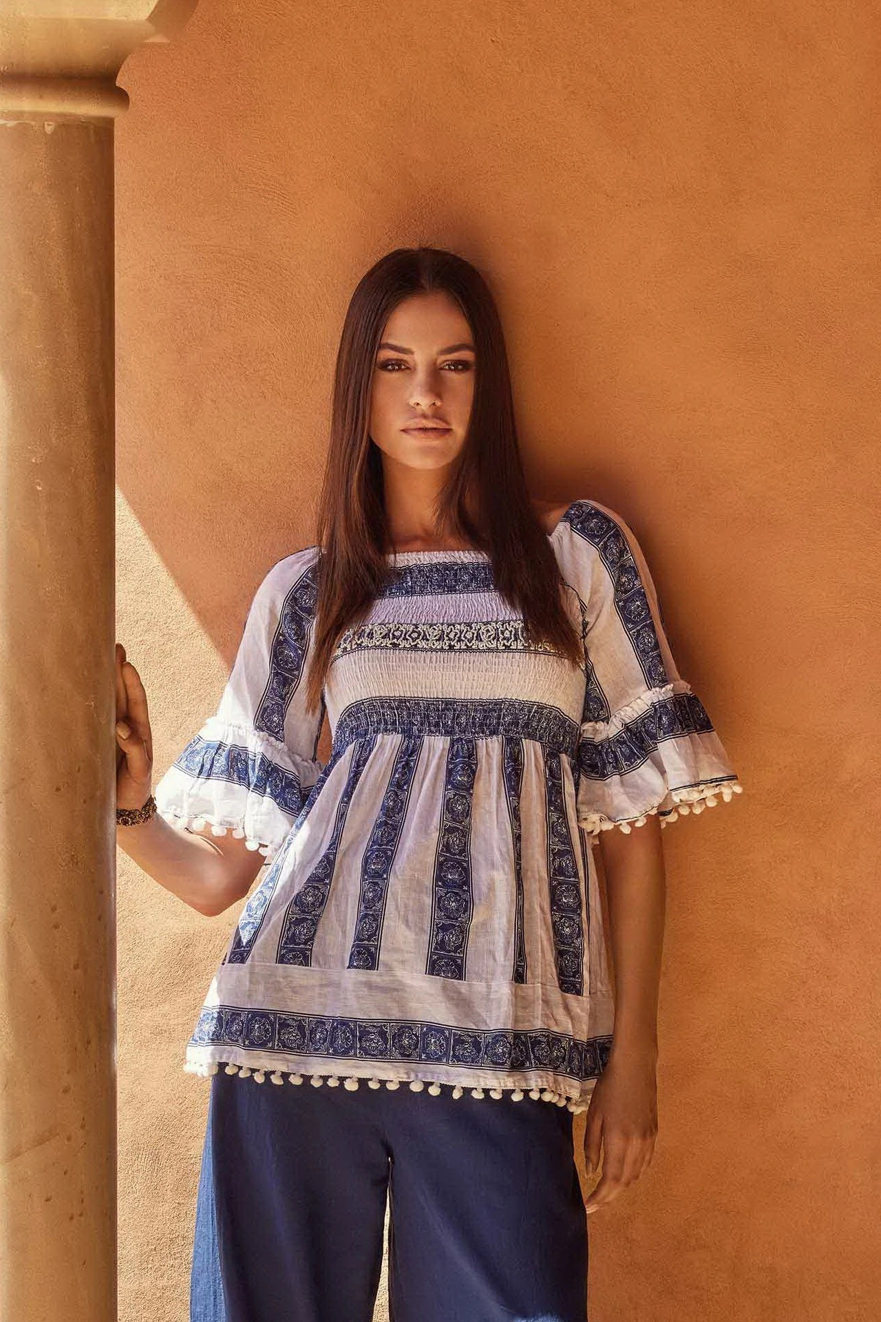 DB24-047 Блуза пляжная DAVID женская удлиненная отрезная по линии талии, лиф собран на резинку буфами, рукава средней длины с широкими воланами по низу, глубокий вырез горловины собран на резинку, блузу можно носить с закрытыми плечами и как декольте. Состав :100% Хлопок. Сделано в Индии по заказу DAVID Италия.